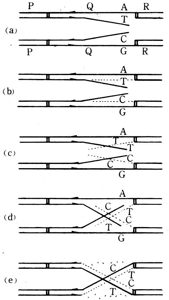 怀特豪斯(H.Whitehouse)和黑斯廷斯(P.J.Hastings)于1965年提出极性子杂合DNA模式(图2)。他们假设,首先单链断裂和局部解开,继而与来自不同DNA分子的单链形成杂合DNA片段,组成一个极性子。每个极性子相当于一个基因,跨越极性子杂合DNA片段的交换都表现正常的相互重组。当交换发生于极性子杂合DNA片段之内时,重组的杂合DNA至少含有一个配对错误的碱基对,这就是形成基因转变的基础。每一个错配的碱基对的变化有两个可能:①错配的碱基对中的一个碱基被酶切除,为正确的碱基所取代,发生误差校正;例如错配的碱基对为C-T,校正后为C-G或A-T;②错配的碱基对C-T,维持到下一次DNA复制,才转换成一个C-G和一个A-T,发生减数分裂后分离。由于杂合DNA可能发生减数分裂后分离,也可能发生误差校正;切开的可以是这一条单链或另一条单链;在校正过程中可以是这一个碱基或另一个碱基被酶切除等,从而导致了基因转变的各种异常分离现象。可见对基因转变的研究,有利于探讨交换和重组的分子机制。(王顺华)