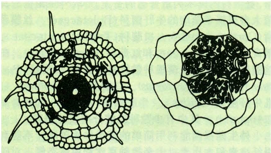 真菌菌丝侵入根组织,在皮层及其细胞内发育,但不进入中柱部分。在皮层中的菌丝体蔓延穿织于细胞间隙,同时也进入细胞内。菌丝进入细胞后往往变形,使先端膨大呈泡囊状,或分叉成丛枝状,因此又称泡囊一丛枝菌根,简称V A菌根(图2)。