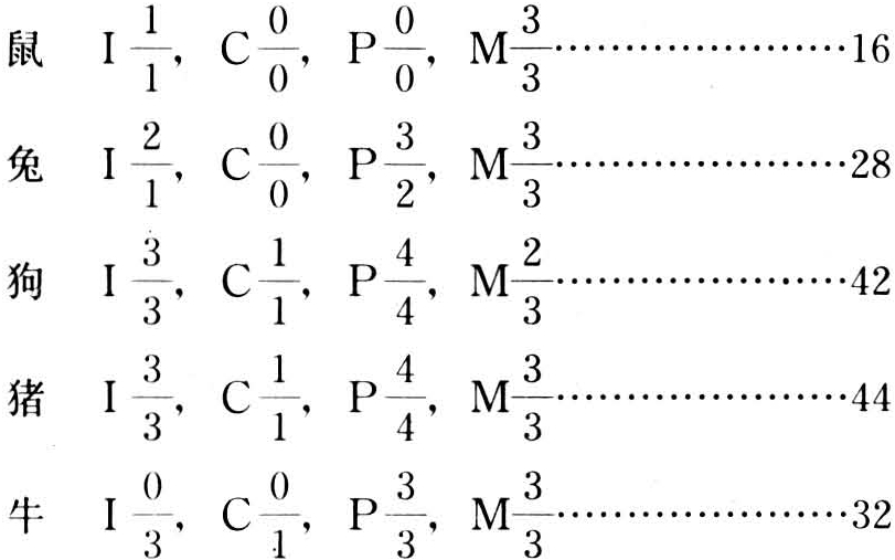 不同种类的哺乳动物齿数不全相同,通常用齿式表示。