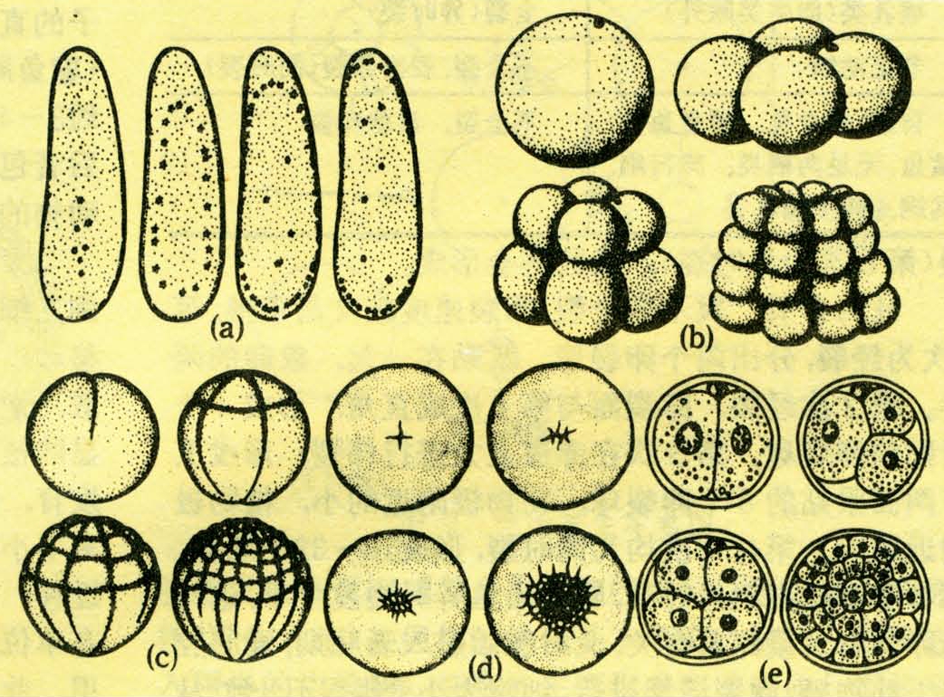 属全裂和辐射对称卵裂。第1次为经裂,分成两个大小相等的卵裂球,为以后成体动物的两侧对称建立基础。第2次卵裂也是经裂,与第1次卵裂成直角,分为4个卵裂球,呈水平分布。第3次卵裂为纬裂,分裂面在赤道稍上方,产生上下两层各4个卵裂球(8细胞期);近动物极的称小卵裂球,近植物极的称大卵裂球,此时卵裂球之间开始出现腔隙,两极有孔与外界相通。第4次又是经裂,形成上下两层16个细胞,细胞间腔隙增大。第5次卵裂为纬裂,形成上下四层32个细胞,腔隙继续扩大,动物极孔封闭。第6次卵裂形成64个细胞,内部已形成完整的腔,植物极孔随之闭合,此为早期囊胚。再经第7、8两次卵裂(第8次为异时裂),囊胚完全形成。