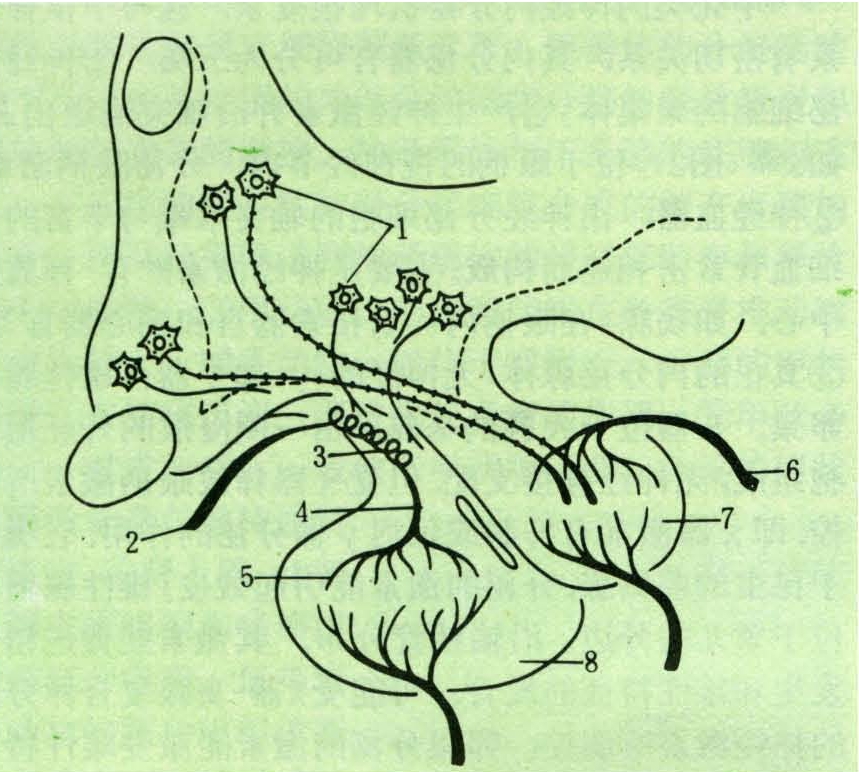 分布于脑垂体的血管主要有:①垂体下动脉。来自颈内动脉,分支进入神经部形成窦状毛细血管网,然后汇合成集合静脉入垂体周围的静脉窦;②垂体上动脉。来自基底动脉环,从结节部上端进入垂体茎,在正中隆起和漏斗柄处形成襻状的初级毛细血管网,然后汇集成十数条门静脉,经结节部进入远侧部再形成次级毛细血管网,构成垂体门脉系统。远侧部的毛细血管也汇入集合静脉再注入垂体周围的静脉窦。下丘脑有关核团的神经分泌细胞产生的激素,有多种释放激素和释放抑制激素。由其轴突输送到漏斗柄处,经垂体门脉系统到腺垂体,调节远侧部各种细胞的分泌活动,共同构成下丘脑腺垂体系统(图2)。(茅亨)