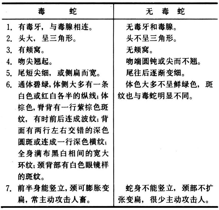 在中国所产的180余种蛇类中,毒蛇约47种。毒蛇的毒牙,有排毒导管与颊部的毒腺相连(图5)。啮物时,可因咬肌收缩压迫毒腺,使毒液经排毒导管和毒牙,注入被咬者的体内,再随血液及淋巴扩散,引起中毒。按毒牙的形态及牙的着生位置,可区分为后沟牙类毒蛇、前沟牙类毒蛇和管牙类毒蛇三大类。后沟牙类毒蛇中除花条蛇产于西北地区外,其他种类(绿瘦蛇、繁花林蛇、紫沙蛇、金花蛇都分布在南方各省;其毒腺分泌的毒液量少,对人身安全的威胁不大。前沟牙类包括眼镜蛇科和海蛇科的种类,前者对人的危害较大。这两科毒蛇的蛇毒中,分别含眼镜蛇毒神经毒、α-环蛇毒神经毒和海蛇神经毒等,可引起乙酰胆碱失去作用,造成机体的神经肌节头之间的冲动传导受阻,短时间内导致中枢神经系麻痹而死。蝰科蛇类是管牙类毒蛇,分布区因种类不同而南北各异,常见和为害严重的有蝮蛇、尖吻蝮、草原蝰、竹叶青、烙铁头等(见表)。