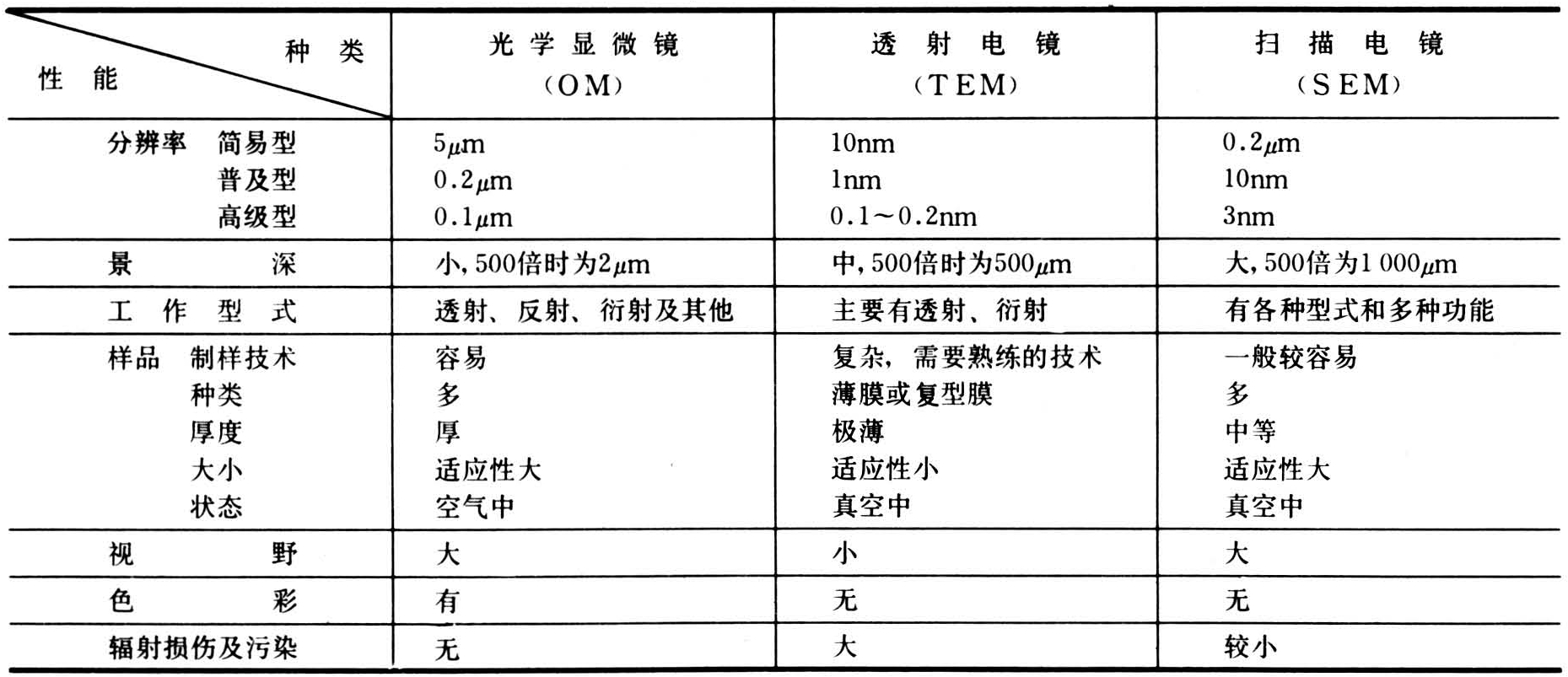 各种显微镜性能比较