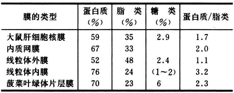 组成细胞膜的脂类有磷脂、糖脂和胆固醇等,其中以磷脂为主要成分。大部分磷脂是磷脂酰胆碱(卵磷脂)、磷脂酰乙醇胺(脑磷脂)和鞘磷脂。甘油磷脂主要由脂肪酸、磷酸和甘油组成。它是兼性分子(双型性分子、双亲媒性分子),其构型是有一个亲水的极性部分(头部)和两条疏水的非极性部分(尾部),当它们处于水相和非水相的界面时很容易形成单分子层,极性头部伸向水中,非极性尾部避开水相伸向空气或油内。在水系统中,两个单分子层相对并合,在两面临水的界面形成类脂双分子层的膜结构,使分子亲水头部伸向膜的两侧表面,疏水的尾部朝向膜的中央,彼此相对应,由脂肪酸构成的中央疏水性屏障是半透膜的结构基础。磷脂分子脂肪酸链的长短和含不饱和脂肪链的多少与膜结构的流动性密切相关,是维持膜功能活动所必需的条件。