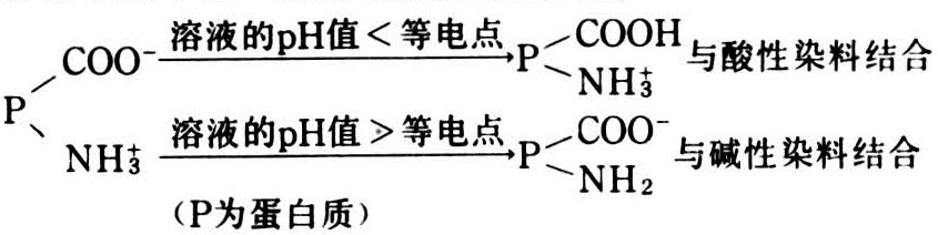 从物理学角度考虑,主要是组织和细胞能吸收、溶解或吸附这些染料而被着色,或者染料通过毛细管作用和渗透作用进入组织和细胞后,由于其内含有酸类、碱类或其他化学物质而发生沉淀,从而使组织和细胞着上色。从化学角度考虑,染料与组织和细胞之间是化学性结合,酸性染料可与组织和细胞中的碱性成分结合;碱性染料则可与酸性成分结合。但实际情况远为复杂,因为蛋白质是两性物质,在等电点时能形成两性离子,溶液的pH值小于该蛋白质的等电点时,蛋白质带正电,可被酸性染料着色;反之,蛋白质带负电,易被碱性染料着色。