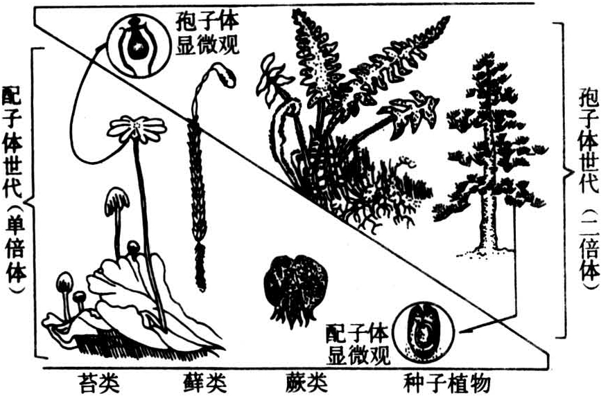 从苔藓植物到种子植物,都是异型配子生殖,在其生活史中有配子体和孢子体之分,植物愈进化,它们的孢子体愈发达。各类植物两个世代发育的生物体各有不同的特点: