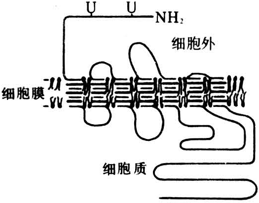 细胞膜或细胞内能识别外来信号(配体),并与之结合,将其转换成细胞内部信号,从而诱发、改变或调节细胞生理活动的物质。存在于细胞膜者称质膜受体,分布于细胞内者称细胞质受体或细胞核受体。关于受体的组成有人认为受体仅指与配体特异性结合的识别部位;也有人认为完整的受体应包括识别部分、效应部分和调节部分,至少应包括识别部分和调节部分。如β-肾上腺素能受体的识别部分为单链多肽,即狭义所指的受体,效应部分为腺苷酸环化酶(AC),而调节部分为三磷酸鸟苷结合蛋白(G蛋白)。但此三者在细胞膜内通常不直接结合在一起,而是各自分开,并且在一定条件下可以移动。当识别部分与相应配体特异性结合后,调节部分和效应部分才相继被激活和偶联,因此有人又称之为受体系统。动物体内免疫细胞识别抗原物质、激素作用于靶细胞、神经递质对触突后膜的作用和触突后电位的产生、受精过程和胚胎发育过程中的组织分化与形态发生、甚至低等生物的结合生殖等都可能有受体在发挥作用。此外,受体与某些药物和疾病都有密切关系。关于受体的研究,近20年来进展迅速,不仅可用电镜组织化学方法观测某些受体在细胞的存在部位,而且有些还可用生物化学方法提纯,甚至利用生物工程技术探讨受体的分子结构。已知β-肾上腺素能受体为一条多肽链,具有7个分别由20~25个氨甚酸残甚组成的疏水跨膜区段,各区段之间由数目不等的氨基酸残基组成的环相连接(图1)。此外,用放射配体结合测定法可以直接识别与放射配体相应的受体,测定其数量及其与配体相结合的动力参数。