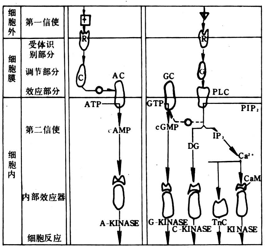 包括所有需与G蛋白偶联的受体,如肾上腺素能受体、毒蕈碱型乙酰胆碱受体和视紫红质(视杵细胞的光受体)等。这类受体多为单链多肽,具有数个跨膜区段,当其与相应配体结合后,立即激活各自的G蛋白,并分别通过各自的机理调节相应酶的活性,将信号传递至细胞内。它们的信息转换系统有环磷酸腺苷(cAMP)—蛋白激酶A(PKA)系统、肌醇三磷酸酯(IP3)—Ca2+—钙调蛋白(CaM)—蛋白激酶(PK)和甘油二脂(DG)—蛋白激酶C(PKC)系统以及光受体—环磷酸鸟苷(cGM P)系统等(图2)。