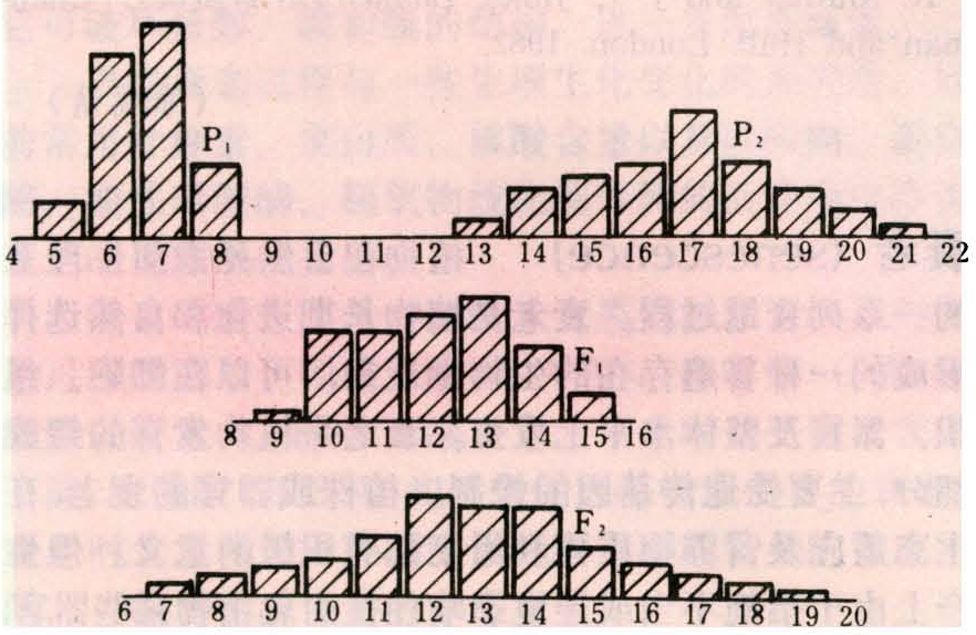 )2n二项式展开时的各项系数。牵涉的基因愈多,则分组数愈多,组间的差距愈小,加上环境对性状的影响和修饰作用,组间的界限实际上就无法区分,因而造成为连续分布。例如玉米穗长的遗传(见图)。