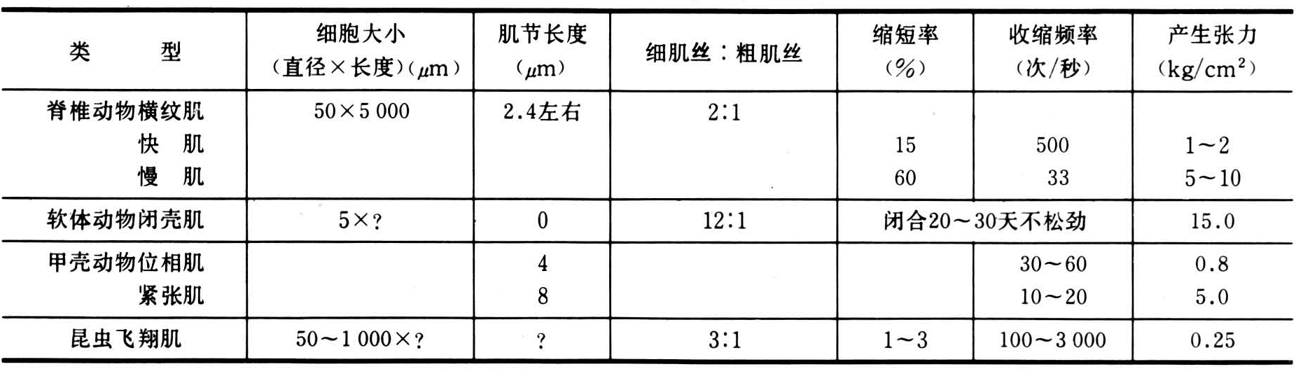 各种肌细胞的结构不同,收缩速度和作功效率也不同(见表)。
