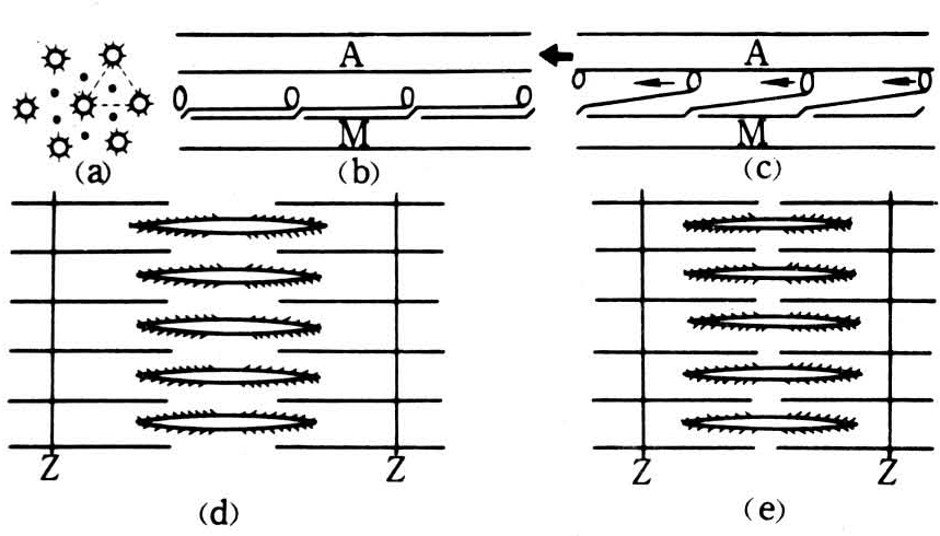 粗肌丝与细肌丝间的相对滑行及肌节收缩示意图
