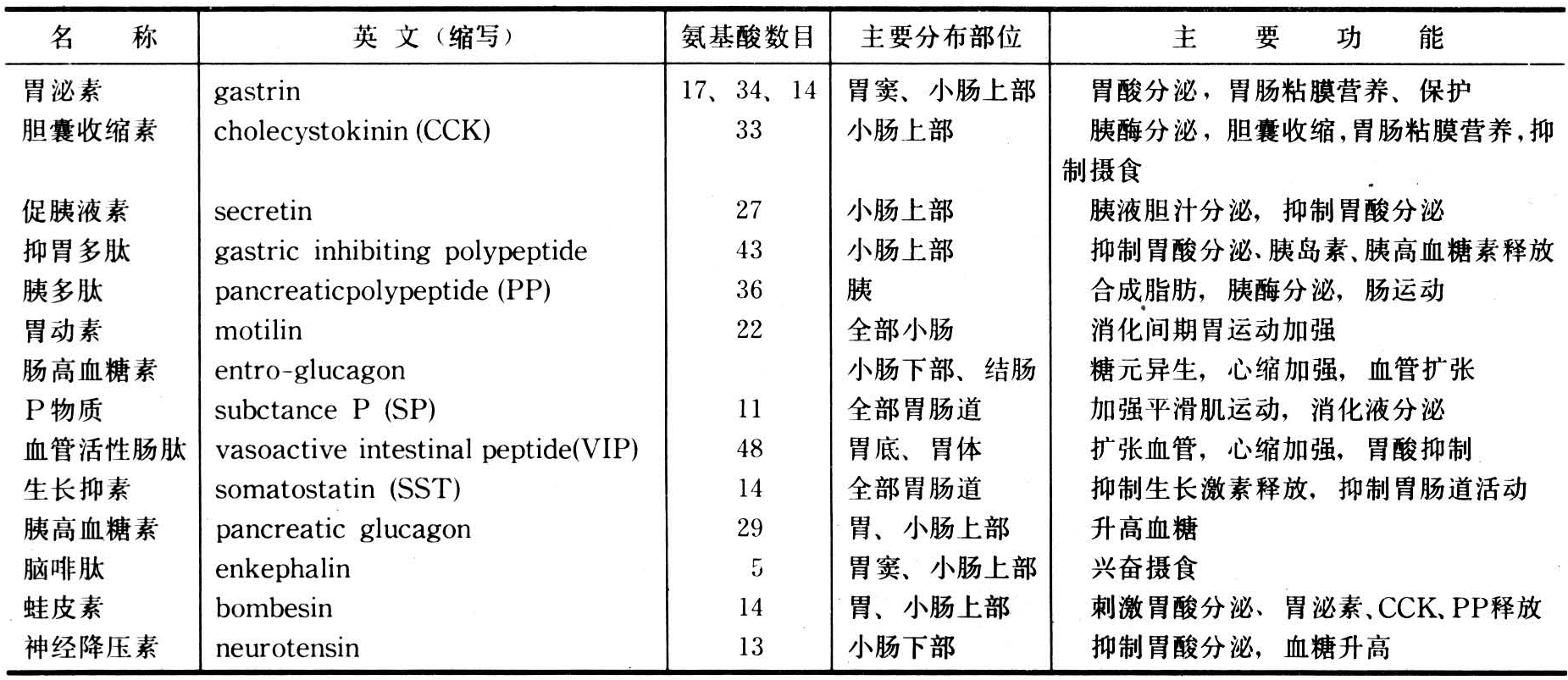 胃肠激素和“候补胃肠激素”的化学、分布和生理功能