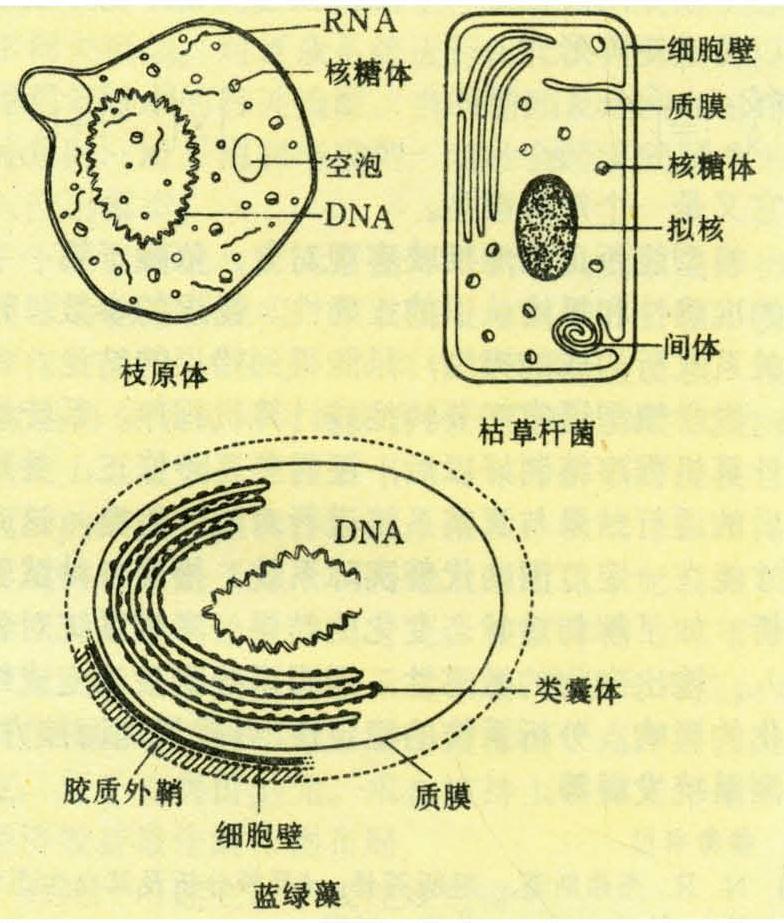 均无完整的细胞核、复杂的内膜系统、线粒体、质体和有丝分裂器,多数以单细胞生物形式存在,少数组成群体,但绝不形成多细胞生物有机体(图1)。 图1 几种原核细胞结构模式图 枝原体在20世纪30年代才确认其存在,是能独立生活的生物体中体积最小者,过去将这群微生物看作类胸膜肺炎有机体(PPLO)。
