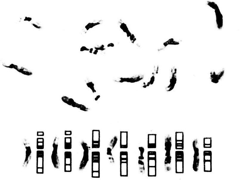 苏联学者德洛涅(L.M.Delaunay)和列维茨基(G.A.Lewitsky)在20世纪20~30年代研究百合科(Muscari)植物风信子和毛茛科(Helleborus)植物芍药的核型时,首先提出核型一词。从早期的研究起,核型分析就与生物的演化相联系。传统用以核型分析的染色体形态结构特征,主要是染色体长度、着丝粒位置、次缢痕、随体、异染色质化程度及分布等。1968年瑞典学者卡斯珀逊(T.Caspersson)发明染色体荧光显带技术,促进了核型分析的发展,由染色体基本形态特征,进而与染色体带型分析相结合,使形态结构难以分辨的染色体借助分带可以加以区分,从而提高核型分析的精确度。
