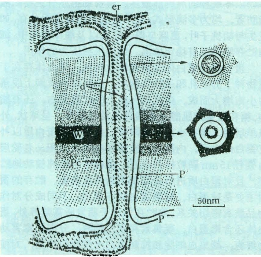 图2 胞间连丝的亚显微结构模式图(纵切、横切)