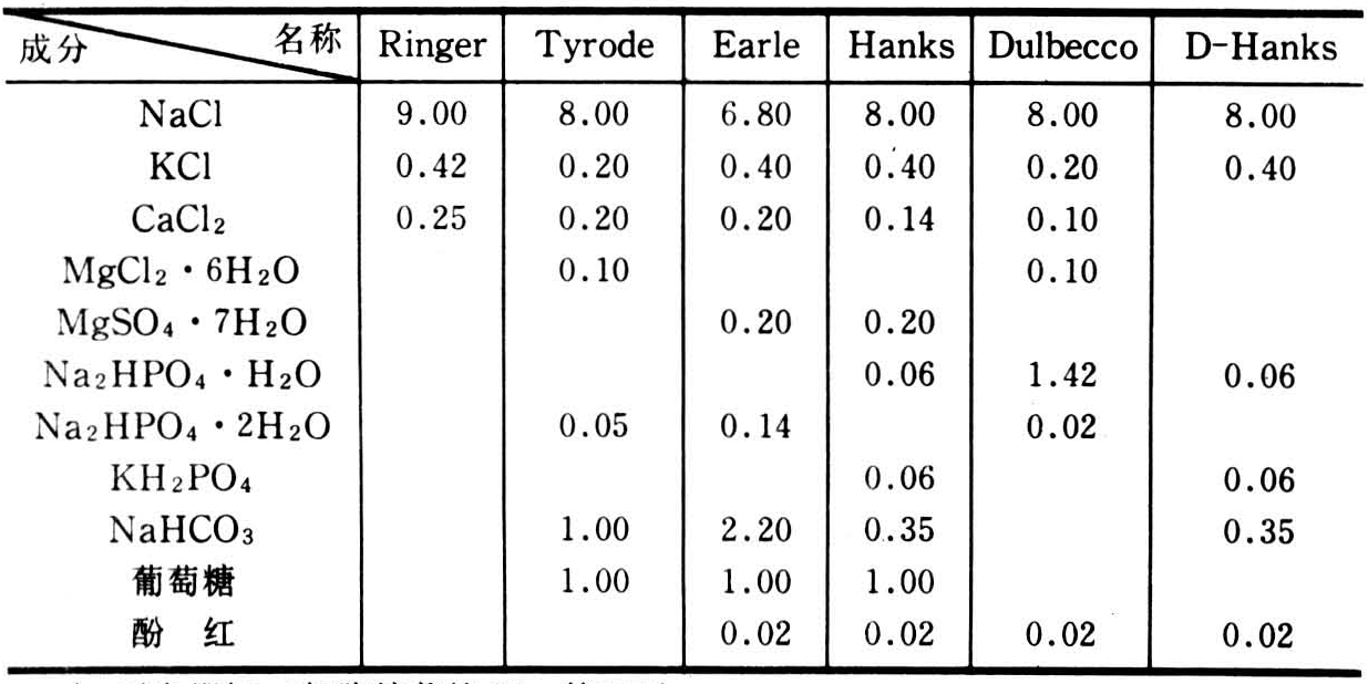 用于洗涤细胞和配制各种细胞培养用液。主要成分为无机盐,有时加葡萄糖。无机盐不仅是细胞进行生命活动所必需,且在维持渗透压、缓冲性和调节溶液的酸碱度方面也起重要作用;葡萄糖作为细胞代谢所需能量来源。各种平衡盐溶液的成分差别不大,主要区别在于缓冲系统(见表)。Earle's BSS液及Hanks液最为常用,后者缓冲能力较弱,须用NaHCO3调节pH;Earle液含较高浓度的NaHCO3,缓冲能力较强,须用5%二氧化碳平衡。配制消化液和特殊用途的洗涤液时则宜选用钙、镁离于含量较低的Dulbecco液和无钙、镁离子的D-Hanks液。平衡液中常加入少量酚红作为指示剂,以便观察培养液的pH变化。
