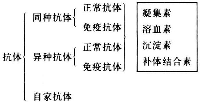 能与血型抗原起特异反应的物质的总称。与所有的抗体一样其化学本质主要是γ-球蛋白。抗体的种类可按抗原的来源以及与抗原发生的血清学反应分类。
