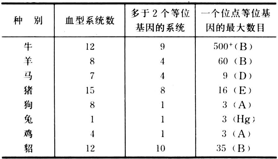 最先发现人类红细胞的ABO血型系统,确定了同种不同个体间存在血液的差异。人类血型研究比较深入,单是红细胞血型就有15系统之多,即ABO、MNSs、P、Rh、Lutheran、Kell、Lewis、Duffy、Kidd、Diego、Yt、I、Xg、Dembrock、Cot-ton。其中A B O、R h和K ell称为三大血型系统,它们的抗原—抗体反应强烈,在输血过程中要特别予以重视。家畜的红细胞血型研究也有进展,不但有特殊的同种抗原,而且某些抗原有类似人类的抗原特性。类B抗原几乎存在于所有动物,兔、猪、牛和羊的红细胞上有类A抗原,兔、牛、羊和大袋鼠的红细胞上有M抗原。以上这些和其他血型物质一起作为动物血型划分的依据。但由于各国研究者所用的方法、试剂和命名符号不统一,所以分类繁多。已知的动物血型系统数见表。