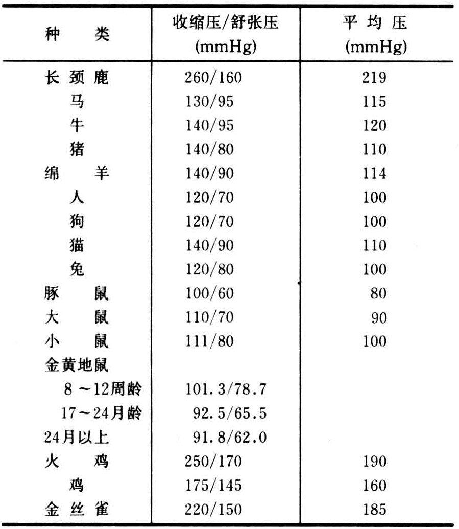 一般所说的血压是指体循环系统中的动脉血压。在心动周期中动脉血压出现周期性变化。心缩时,血压急剧升高,到收缩期的中期达最高值,称收缩压;心舒时,血压下降,至心舒末期达最低值,称舒张压。收缩压与舒张压之差值称为脉搏压。动脉血压可因动物种类、性别、年龄及不同生理状况而有差异。几种动物的正常血压值见表。