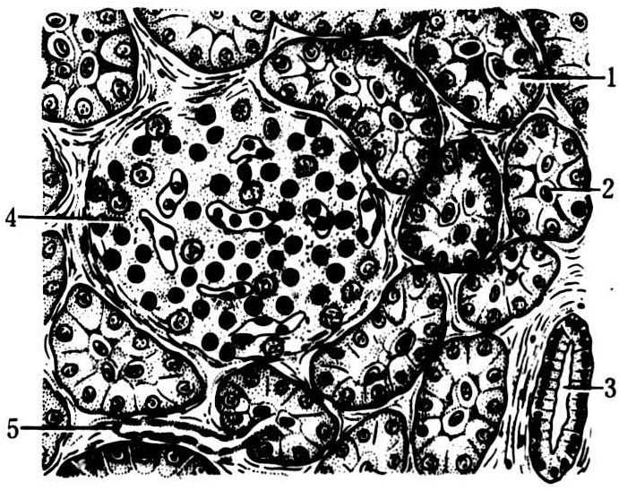 为复管泡状腺。腺泡细胞呈锥形,顶部朝向腺泡腔,基部含有球形的核,并富有粗面内质网,核上区有高尔基复合体和许多酶原颗粒,后者是各种胰酶的前身,排出细胞外即形成胰液中的胰蛋白酶、胰脂肪酶和胰淀粉酶。从腺泡通出各级导管,最小的导管称闰管,较长,管壁由单层扁平上皮构成,管的末端常常伸入腺泡内,伸入的管壁细胞称泡心细胞(见图)。闰管逐级汇合成小叶内导管,小叶间导管,最后形成粗大的主胰管,管壁增粗的同时上皮也变高,由立方形、低柱状直至高柱状。导管上皮能分泌水和钠、钾、重碳酸盐、磷酸盐等电解质,它们与各种胰酶组成胰液。