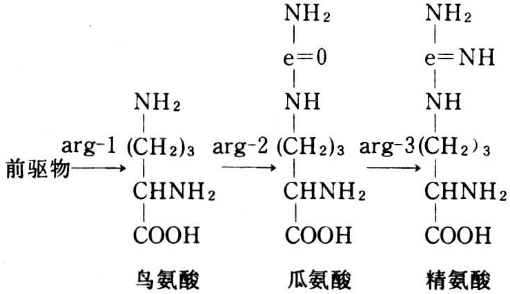 式中 由前驱物到精氨酸的各个代谢环节分别由基因arg-1、arg-2、arg-3控制,并由基因编码产生的酶参与催化。故知,上述三种情况分别由于基因arg-1,arg-2和arg-3发生突变引起的生理障碍造成的。