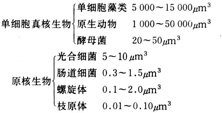 绝大多数原核生物种类是单细胞生物。原核生物的大小悬殊,枝原体的体积只有0.01~0.10μm3;最大的单细胞光合细菌可大到5000μm3,原核生物比单细胞真核微生物的平均大小小得多,例如: