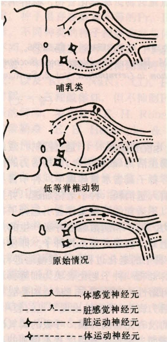 文昌鱼脊神经的背、腹根交错从脊髓发出,不合并,因此又称为背侧和腹侧神经。背根在正对两肌节之间分出,沿肌间隔分布至皮肤和内脏,为混合性,含有一般体传入、脏传入和脏传出三种纤维。脏传出纤维的胞体位于脊髓内。体传入和脏传入纤维的胞体或位于脊髓内,或分散于神经内,均为双极神经元,不聚集形成脊神经节。腹根特殊,由肌节的肌纤维构成,脊髓与运动神经元的突起形成运动终板。在圆口类,七鳃鳗的脊神经背根与文昌鱼相似,含有三种神经纤维,感觉神经元大多仍为双极性,但胞体已集中在背根上形成神经节。腹根除含有体传出纤维外,并有一些脏传出纤维;盲鳗的背腹二根开始汇合,但不甚紧密。至圆口类以上,背腹二根经常汇聚集合。背根在许多硬骨鱼类仍含有许多脏传出纤维,而软骨鱼和四足动物只含传入纤维。软骨鱼类的背根感觉神经元为双极神经元,硬骨鱼类有双极、假单极和中间型神经元,两栖类主要为假单极神经元,羊膜类则几乎全为假单极神经元。腹根含有体传出和所有的脏传出纤维。至此,传入和传出两种纤维,分别集中构成背根和腹根。背腹二根集合为脊神经干后,又分为三支:背支分布于躯体的轴上部结构;较粗的腹支分布于轴下部包括附肢的结构;第三支为脏支,又称交通支,分布于内脏。这三支都含有传入和传出纤维。腹支在相当于附肢处形成神经丛,至四足动物成为复杂的臂丛和腰荐丛。
