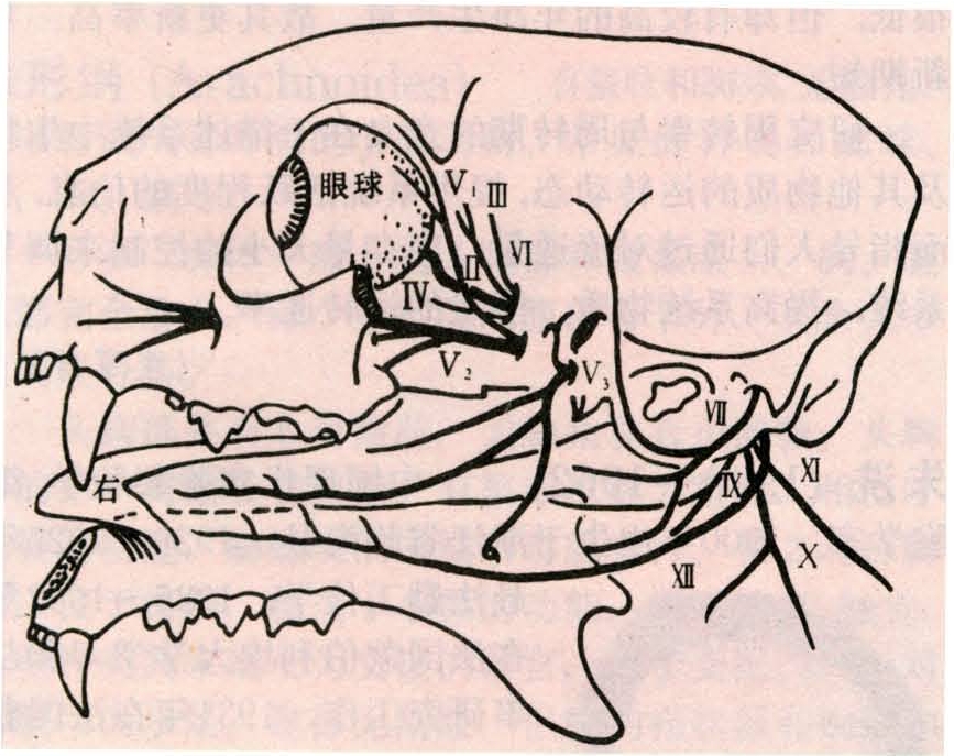 图2 哺乳动物(猫)的脑神经分布(左侧下颌骨向下翻开,颧弓锯断)