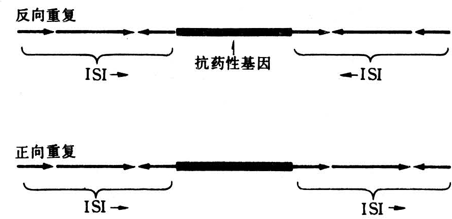 20世纪60年代后期,在大肠杆菌中发现一种“插入序列”(简称IS)的DNA片段,其插入能引起频率很高的多效性突变。目前已知的I S因子的大小一般在700~2000碱基对(bp)之间,它们只含有与转座有关的基因和序列,共同的特征是两端具有反向重复序列。IS因子不仅具有自身移动的能力,当两个IS因子相距很近时,可以作为一个单位携带夹在中间的基因一齐移动。这种复合的单位称作转座子(简称T n)。转座子依所携带的基因的不同而可分为两类:①组合型。由两个相同的IS因子夹一个抗药性基因构成(图1),复合单位中的两个IS因子可以以正向重复或反向重复的构型存在。②Tn3型。包含一个较大的片段(约5000bp),每个转座子携带有3个基因,一个基因编码β-丙酰胺酶(与氨卡青霉素抗性相关),另外两个基因转座酶基因(TnpA)和阻遏物调节基因(TnpR)与转座相关。所有的Tn3型转座子两端含有短的反向重复序列(38dp),而不带有IS样的因子。