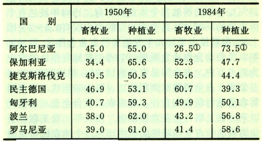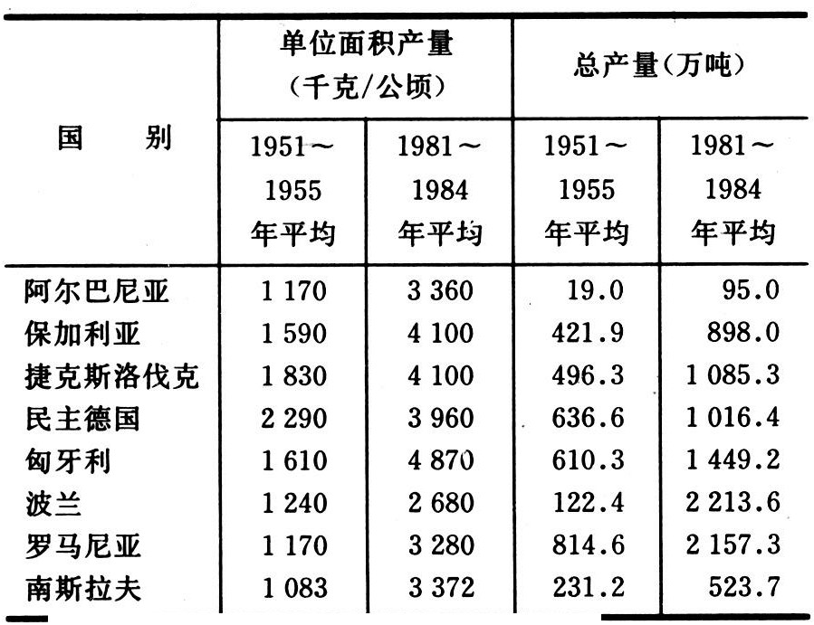 50年代上半期和80年代上半期,除民主德国外,其他国家谷物单产均提高1~2倍。因此,多数国家的谷物播种面积虽有缩减,但谷物总产量的增长较大(表2)。人均谷物产量,1984年匈牙利为1500千克,罗马尼亚、保加利亚都超过1000千克,其他国家除阿尔巴尼亚外,在670~800千克之间。谷物的增产使各国饲料谷物的自给程度提高。波兰由1976~1981年平均进口谷物 710 万吨减到1982~1984年平均进口360万吨。匈牙利、保加利亚在20世纪70年代已是谷物的净出口国。自50年代以来,多数东欧国家的农业生产结构发生如下变化:①畜牧业发展速度超过种植业(表3)。②畜牧业在农业总产值中所占的比重增加(表4)。③畜牧业中养猪、养羊及家禽饲养业发展较快,养牛业发展较慢。如1984年罗马尼亚猪的存栏数1721万头,比1950年增加6.7倍。④居民食品消费结构中畜产品成为主要食品。1984年民主德国人均年消费肉类94千克,波兰人均年消费牛奶426千克(其他国家在240千克以上)。种植业中蔬菜、水果、饲料的播种面积增加。罗马尼亚、匈牙利、保加利亚三国的多年生植物面积由1950年的69万公顷扩大到1984年的157万公顷。