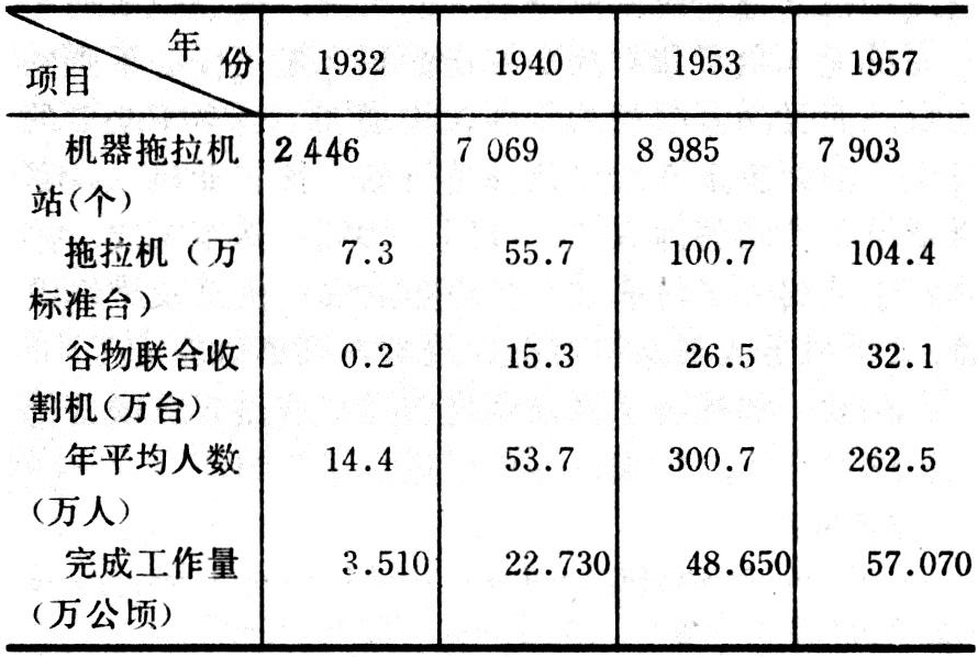苏联的第一个国营机器拖拉机站,是1928年在敖德萨州谢甫琴柯国营农场拖拉机队基础上建立的。1930年12月29日决议颁布之后,大规模地展开了机器拖拉机站的建设。1931年共有机器拖拉机站1400个,1932年底达到2446个,为将近50%的集体农庄提供了技术服务,机器拖拉机站开始成为集体农庄建设中的物质技术中心。1933年初,为了从政治上、组织上和经济上巩固集体农庄,在机器拖拉机站中建立了政治部,并选派17000名干部到机器拖拉机站政治部工作,从而使之成为集体农庄建设中的政治中心。1934年底,机器拖拉机站政治部与当时的区党委会合并。随着拖拉机和农业机器制造工业的发展,机器拖拉机站迅速增加,1953年达到8985个。同时,其规模也日益扩大。按15马力计算的拖拉机标准台数,1953年平均每个站增加到100台以上。根据1953年9月苏联部长会议和苏共中央批准的标准编制,除总工程师和总农艺师之外,还要求机器拖拉机站设有经济师、土地规划工程师、兽医、饲养技师、建筑技术员等各种专家。同时,机器拖拉机站的主要机务人员(拖拉机队正副队长、拖拉机手、联合收割机手等)也由季节工人改为固定编制。此后,机器拖拉机站的平均编制达到300人以上(见表)。
