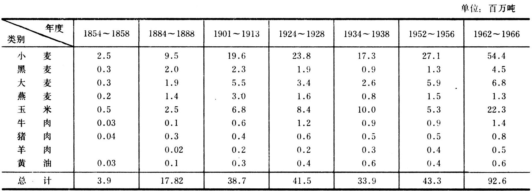 但是农产品生产国际分工的实现,以及在这基础上农产品贸易世界市场的形成,还有待交通革命和冷冻工艺的出现及推广。而这是在19世纪70~90年代发明和使用电力为动力后才实现的。世界农产品中食品的出口数量,19世纪50年代约400万吨,而80年代已达1782万吨,第一次世界大战前约为3870万吨,第二次世界大战后的最初时期大体上也仍维持在这个水平;只是到了20世纪60年代,世界农产品中食品的出口量才成倍增长(见下表)。