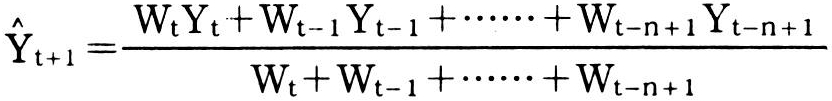 式中 n为移动期项数;t为每个移动平均数中末项的时期数;Y为每期数值;为末项为t时期的移动平均数。第二,加权移动平均法。按距预测期的远近确定权数,计算过去若干期实际水平的加权算术平均数,作为预测趋势值的方法。计算公式如下: