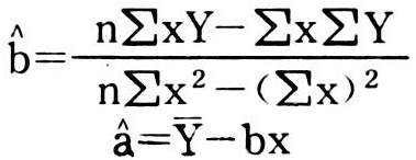 式中 Y为因变量;x为自变量;b为回归系数;a为回归常数。求解的方法有:平均值法、目估作图法、最小二乘法。平均值法的做法是,将几组数据分别代入回归方程,然后将这几个方程平均分为2组,把每组内的方程分别相加,得到一个二元一次联立方程,解之求得。目估作图法,是把n组数据点画在坐标纸上,假如这些点群形成一条直线带,就在点群中画一条直线,使得直线两边的点差不多相等。这条直线可近似地作为回归直线,利用它可在坐标纸上直接进行预测。最小二乘法,是估计误差最小的要求,求出回归系数