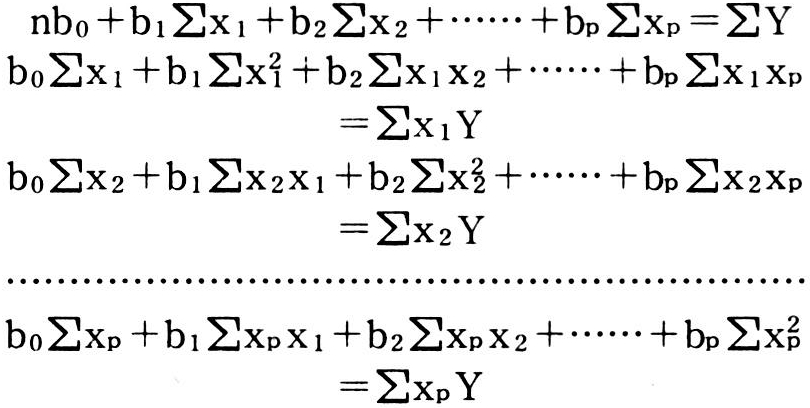 式中 b为常数;b1、b2…bp为Y对x1、x2…xp的回归系数。可由正规方程求解回归常数和回归系数。