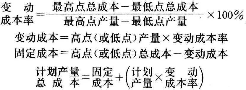 部分和固定部分,然后预测计划产量的总成本。它适宜于成本发展趋势变动不太大的情况下使用。其计算方法是先通过两个时期产量变动差额和成本变动差额的比较,计算出单位产品的变动成本率,再根据变动成本率和高点或低点的产量计算出变动成本,从总成本中减去变动成本