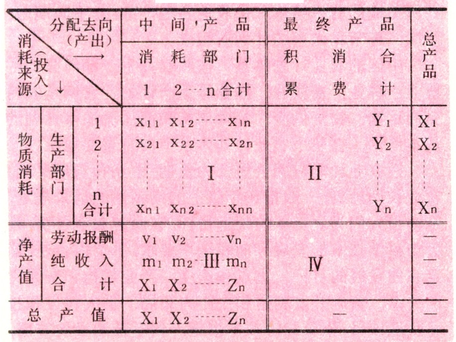 亦称“部门联系平衡法”。利用直接消耗系数建立起各部门投入与产出之间的数量依存关系,是将数学方法和电子计算技术引入农业计划的具体做法。投入产出表分实物和价值两种。在农业再生产中,某部门要将其产品或价值的一部分作为产出销售或转让给另一部门。同时,又需要从另外部门获得一部分产品或价值作为投入。通常是把投入作为竖(纵)列,把产出作为横列,编制出状如棋盘式的表格。投入产出表的格式为四个象限:部门间交易象限(Ⅰ)、最终用途象限(Ⅱ)、增加价值象限(Ⅲ)以及直接购买要素象限(Ⅳ)(西方某些国家编制投入产出表将最终用途象限标为“Ⅰ”,将部门间交易象限标为“Ⅱ”)。其具体表式如下: