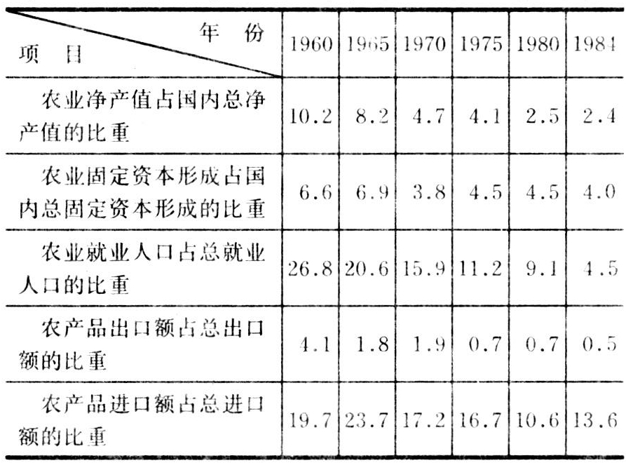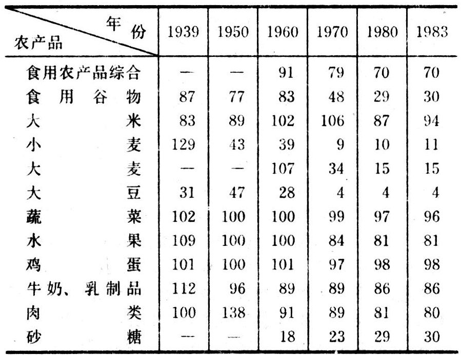 第二次世界大战后,日本农业经历了10年左右的恢复和发展,以1961年颁布《农业基本法》为标志,农业发展进入新的阶段。该基本法规定的农业政策主要是:①生产政策。中心内容是有选择地扩大农业生产。重点发展需求量趋于增加的农产品,如牛奶、肉类、蔬菜、水果等;限制生产需求增加不大的农产品,如水稻、大豆、油菜籽等;对需求趋于减少、国际竞争力较弱的农产品如甘薯、旱稻、杂粮、大麦、蚕茧等,则促其减产或转产。②价格政策。其核心是稳定重要农产品的价格。自50年代起,政府对农产品价格的控制分为两类:一是直接控制。即产品由政府统购统销,并直接制定购销的行政价格,称为管理价格制度。适用于大米和烟草。一是间接控制,即产品自由交易,价格由供求关系决定。同时根据生产成本、物价变动等因素,政府及有关机构对不同产品分别制定行政价格,并通过购进、售出和补贴等调节措施,维持市场价格的稳定。属于间接控制的有最低保证价格制度(适用产品为薯类及其加工品、麦类、砂糖等)、稳定带价格制度(即使市场价格维持在有一定上下限的幅度带之内,适用于猪肉、牛肉、蚕茧、生丝等产品)、稳定指标价格制度(是将市场价格稳定于一定水平,如奶制品)、差额补贴制度(如大豆、油菜籽、加工用牛奶)、稳定基金制度(即当上市农产品价格跌到一定水平以下时,由生产者团体积累的稳定基金予以补偿,适用产品有蔬菜、生猪、菜牛、鸡蛋、加工用水果)等。③农业结构政策。中心内容是对农地改革后形成的小农经济结构进行改组,促进小农户脱离农业,扶植“自立经营农户”,发展大规模经营。自立经营农户即其生产规模能保证家庭劳动力充分就业,依靠农业收入可得到与其他产业人员同等收入水平的农户。为此,制定法令,取消对土地持有数量的限制,放宽土地租赁的有关规定,允许农业协同组合发挥中间人作用,促进土地的出租。同时政府发放低息贷款,扶助大农户购买土地。1960~1983年,自立经营农户在农业中所占的比重变化如表4。