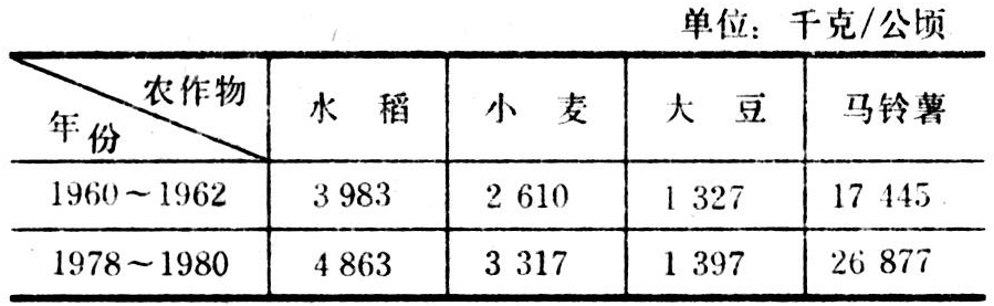 水稻是日本最主要的农作物,全国各地均有种植,主要产地为北海道、东北、关东、九州,其中东北地区稻米产量占全国的1/3。麦类是与水稻复种的作物,分布也较广。马铃薯主要产于北海道、长崎等地。牛、羊主要饲养于北海道、九州、东北等地。猪主要分布于九州、关东、东北。农业产值的年平均增长率 1957~1960年为4%,1960~1970年为2.3%。1960~1970年 国民生产总值年 平均增 长率 为 11.6%。农业增长速度慢于整个国民经济增长的速度。农业在国民经济中的比重虽呈下降趋势(表1),但与其他产业的联系则不断加深。1979年,农业及农业关联产业(如农业生产资料供应,农产品购销、加工、储运等部门)的产值占国内生产总值的13%,其就业人口占全国总就业人口的24%;在全国生产资料市场的销售额中,农户购置占7%;在全国消费品市场销售额中,农户购买占16%。直接从事农业的劳动力,由1950年的1613万人减少到1980年的542万人。在历史上,日本农业以种植稻、麦为主,尤以水稻所占比重最大。20世纪60年代以后,畜产品、蔬菜、水果生产增长较快,农业生产的部门结构发生了新的变化。19 5 5年,在农业总产值中稻米占5 2.6%,其他粮食作物占18.4%,蔬菜占6.3%,水果占3.7%,畜产品占9.7%,养蚕 占3.1%;1980年则变为稻米占30%,其他粮食作物占1.9%,蔬菜占17.5%,水果占7.3%,畜产品占29.9%,养蚕占1.5%。战后恢 复时期(1946~1955年)主要靠开垦 土地、增施肥料等措施增加粮食产量,解决粮食供应不足的问题。19 5 5年以后,农业中推广应用现代科学技术,培 育良种,增施化肥和使用农药。60年代开始推广中、小型拖拉机等农业机械,70年代后大型农机增加,逐步实现 了农业机械化。198 3年全国农户拥有15马力以上大型拖拉机158.4万台(平均每百户35台)、联合收割机 102.1万台(每 百户22.4台)、插秧机 202.5万台(每百户44.8台),提高了劳动生产率。农业劳动生产率指数以19 60年为100,1970年为185.5,1980年为309.8。20年间提高 2 倍。主要农作物的单产也有较明显的提高(表 2)。但是,60年代以后,由 于耕地面积减少,除大米、畜产品、蔬菜、水果生产叮基本自给外,食用农产品总的自给率呈下降趋势(表3)。