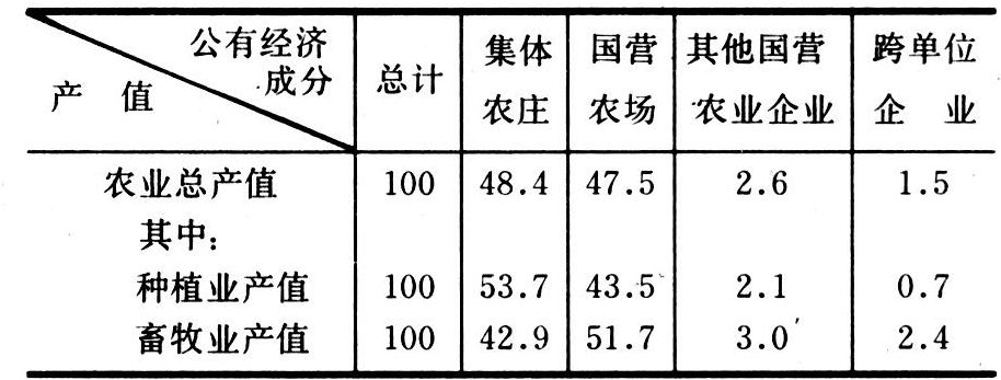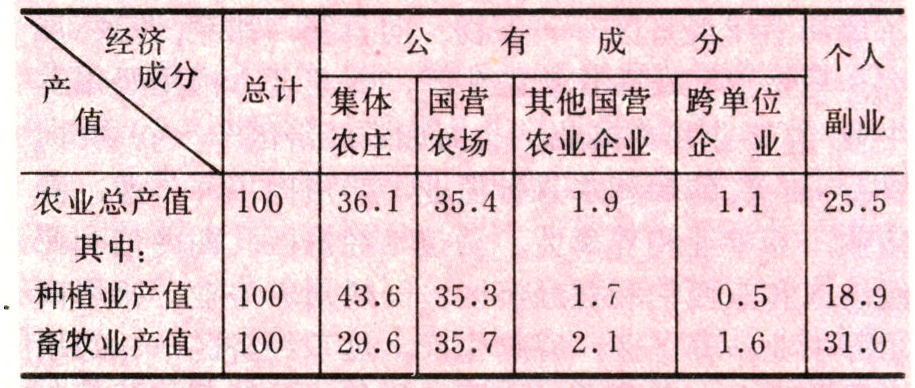 据1976~1980年统计,在农业总产值中,公有经济 占74.5%,个人副业 占25.5%(表 1);在 公有经济的农业产值中,集体农庄占48.4%,国营农业企业占50.1%,跨单位企业占1.5%(表 2)。在农业商品产值中,公有经济占89%(集体农庄和跨单位企业占45%,国营农业企业占44%),个人副业占11%。公有经济的商品率近74%,而个人副业的商品率约27%。