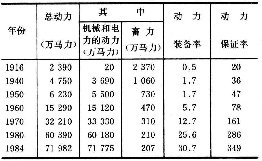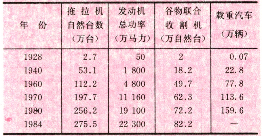 苏联自20世纪20年代着手进行农业的技术改造(首先是农业机械化),经过半个世纪的努力,农业已初步实现现代化。1984年同1940年相比,农业中的动力功率增长14倍(表 3);农业拥有的拖拉机增加4.2倍(自然台,表 4),谷物联合收割机增加3.5倍(自然台,表 4);每公顷耕地化肥施用量(折合有效成分计算)增长近27倍(表 5),灌溉面积扩大 23倍(表 6)。