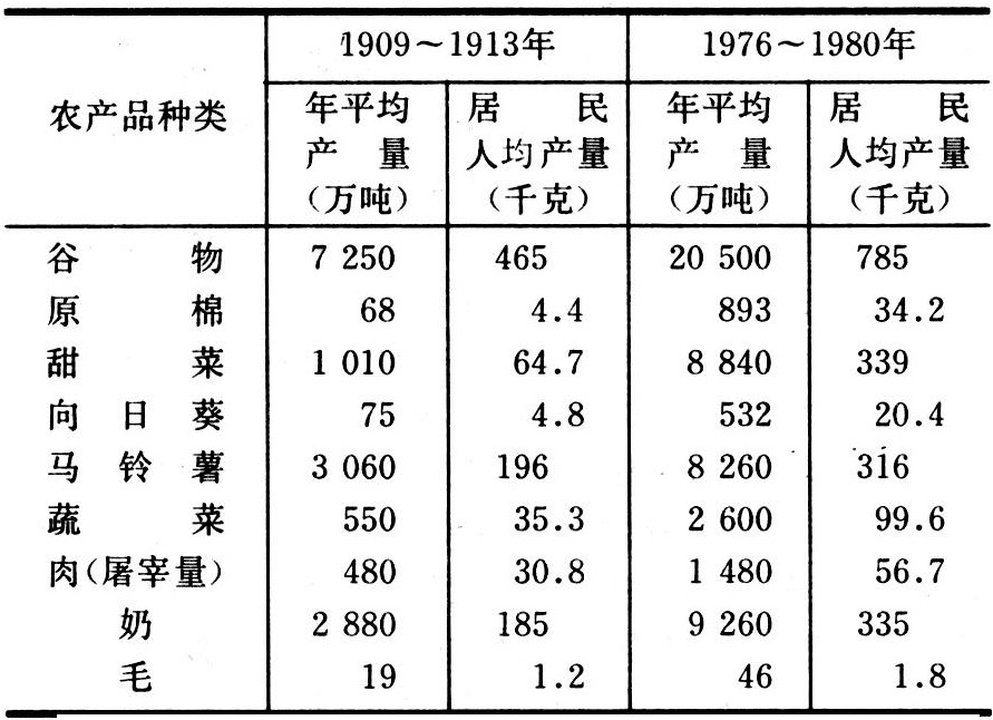 20世纪初以来,苏联农业生产有明显增长。以1976~1980年同1909~19 13年 相比,农业总产值增长2.81倍,按人口平均计算的农业产值增长1.28倍(产量见表 7)。同期人 口增加70%。农业生产结构、居民的食品结构以及食品消费量都有明显变化(表 8)。