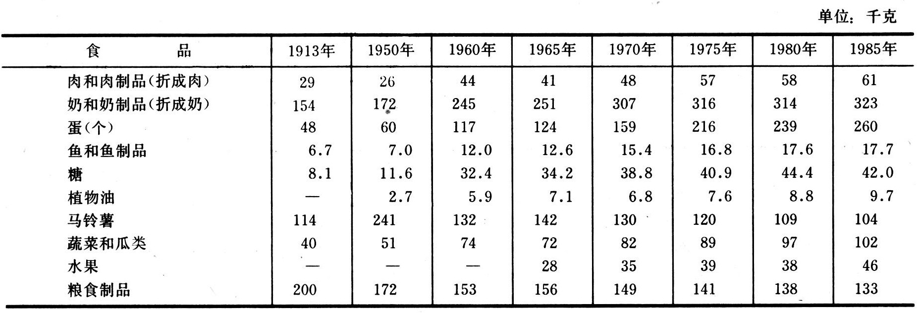 表8 苏联1913~1985年按每个居民计算的主要食品实际消费量