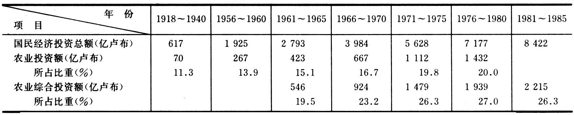 苏联农业发展速度很不稳定,在不同时期有快有慢。①1953年以前。在20~30年代,完成了农业集体化,较快地发展了农业机械化,在世界上第一个建立起社会主义农业体系,从而促进了社会主义工业化的发展,经受住了1941~1945年卫国战争的严峻考验。但是,由于农业集体化过程中未能坚持自愿原则,加之长期片面强调优先发展重工业,农产品采购政策对农民控制得太紧,农业生产发展缓慢。按现在疆域计算,1913~1953年40年中,农业总产值仅增长45.3%,年平均增长率低于1%,谷物总产量甚至低于1913年水平(1913年谷物总产量8600万吨,1953年仅有8250万吨)。②1953~1958年。片面发展重工业,忽视农业的方针有所改变,而且在此期间改组了机器拖拉机站,改革了农业计划制度和农产品采购制度,提高了农产品收购价格,增加了农业投资,并在俄罗斯联邦东部和哈萨克共和国开垦荒地3 78 3万公顷,使农业生产发展较快。1958年同1953年相比,农业总产值增长约50%(种植业产值增长53.2%,畜牧业产值增长46%),年平均增长率达8%。③ 1958~1964年。由于在农业投资政策、农产品价格政策和对农业生产的指导等方面出现了一些失误,农业发展速度下降。六年中农业总产值增长13.5%(种植业产值增长19.3%,畜牧业产值增长5.9%),年平均增长率下降到2%。④ 1964~1985年。开始注意提高农业集约化水平,大幅度增加了农业投资(表9),提倡集体承包制和农业跨单位合作,并多次提高农产品价格以及实行集体农庄庄员有保障的劳动报酬制度。但由于管理制度仍然落后,农业劳动者的生产积极性不高,农业投资效果低;加之气候条件不利,农业产量在不同年份之间起伏悬殊。198 1~198 5年 同 196 1~196 5 年相比,农业总产值增长58.2%(表10),年平均增长率为1.29%。
