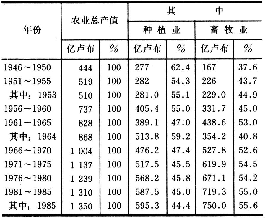 表10 苏联年平均农业总产值及其结构的变化(按1973年可比价格计算)