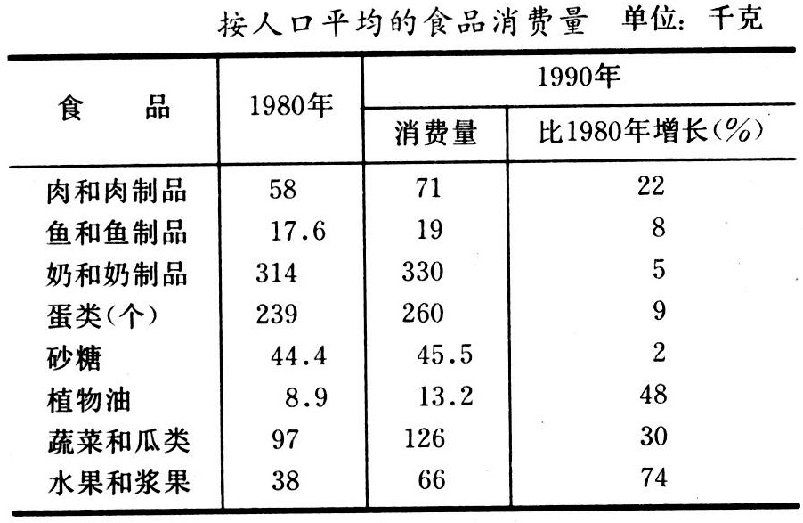 表1 《苏联1990年前食品纲要》规定的按人口平均的食品消费量