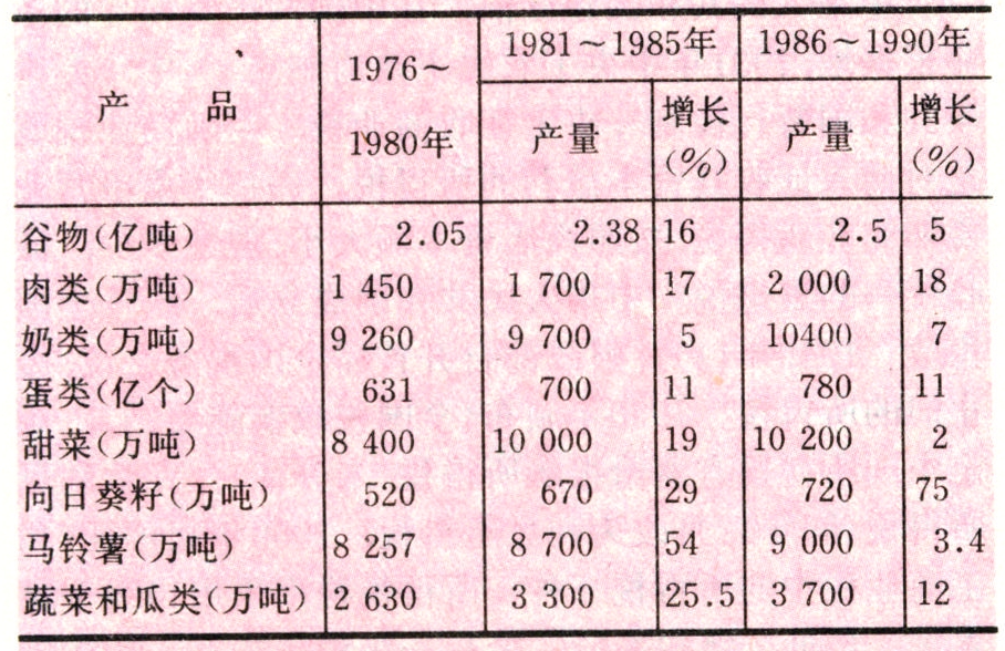 由于连年旱灾以及管理机制等方面的原因,1981~1985年的谷物生产计划未能实现。为保证国家对谷物的需求,每年大约进口3000万~4000万吨谷物。在大量进口谷物的条件下,畜牧业生产基本上完成了原订的计划指标。