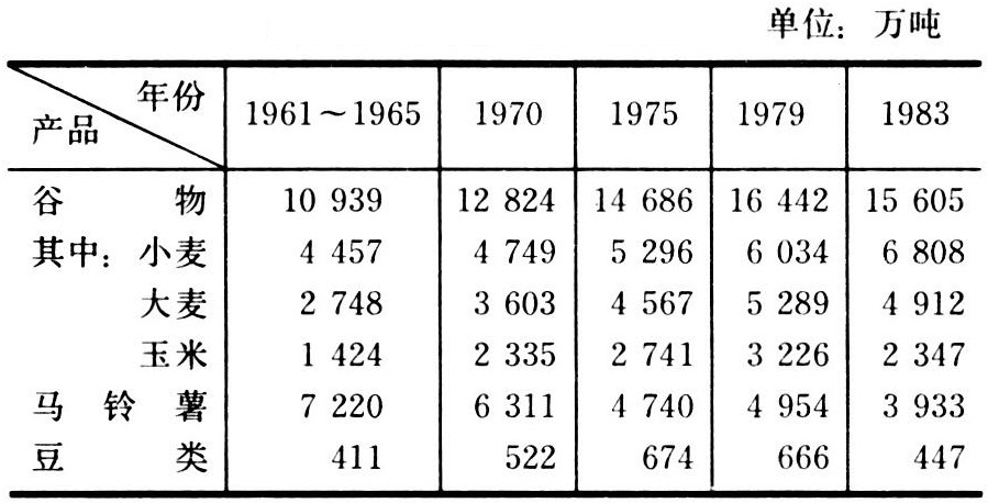第二次世界大战以前,西欧国家农业生产发展缓慢,有的国家甚至出现衰落。20世纪50~60年代以后,各国发展集约经营,大量使用农业机械和化肥,努力提高农产品单位面积产量,农业劳动生产率提高的速度超过其他经济部门。1947年西欧各国共有拖拉机50多万台,1982年为710.7万台,比1947年增长了14倍多。1982年联合收割机和脱谷机使用量70.9万台,挤奶机173万台,许多农作物的田间管理、运输、入库已实现机械化。各国也十分重视优良品种的研究、培育和推广。农业生产指数以1969~1971年为基期,1975年为110%,1977年为112%,1979年为120%。1986年谷物每公顷产量:荷兰7494千克,英国6060千克,法国5240千克,意大利3857千克。畜牧业产值占农业总产值的比重,英国、荷兰、丹麦、联邦德国和爱尔兰在70~80%之间,西班牙、意大利均近50%。主要畜产品为肉、奶。1981年西欧肉类总产量2754万吨,其中禽肉533.5万吨。1983年西欧牛的存栏数9556万头,其中法国2365.5万头,占24.8%。同年,西欧牛肉总产量809.6万吨,鲜牛奶产量142634万吨。乳牛产奶量,1983年荷兰每头牛产奶5333千克,挪威5300千克,瑞典5680千克。