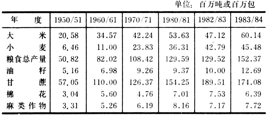 印度独立初期,要进口粮食,1949/50年度进口352万吨,1951/52年度进口386万吨。经过努力,第一个五年计划(1951~1956)期间,粮食增产25.4%,其他作物增产13.1%。50年代后期,经济发展重点移向工业,农业生产又陷于停滞状态。1965/66年度粮食进口1000万吨以上。60年代中期以来,在发展农业生产上采取了多种措施;①扩大高产品种播种面积。小麦、水稻、玉米、高粱、小米五类粮食作物的高产品种播种总面积,由1966/67年度的188万公顷增加到1983/84年度的5250万公顷,17年增加了34.5倍。1983/84年度粮食总产量为1.52亿吨,比60年代中期增产1.1倍。70年代共进口粮食2132万吨,1980~1987年总共只进口粮食767万吨。②兴修水利设施。灌溉总面积由1960/61年度的2800万公顷增加到1987/88年度的6600万公顷。③增加各种农业投入。农用拖拉机由1966/67年度的5.4万台增加到1980/81年度的52.3万台。同期,水泵由88.6万台增加到900万台。化肥消费量由1965/66年度的78.5万吨增加到1984/85年度的821.1万吨,增长10.5倍。自1970年起实施为期16年的奶业发展计划,改良畜种,奶的总产量由1970年的2000万吨增加到1985年的4000多万吨,人均54千克。