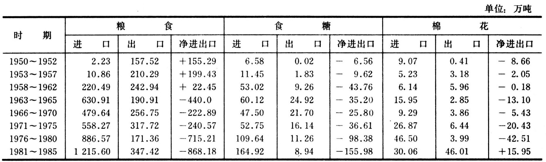 20世纪50年代,中国是粮食净出口国,食糖和棉花少量进口;60年代到80年代初,中国成为粮食、棉花的净进口国;从1983年开始,中国农业连续丰收,主要农产品进口量减少,活猪、水产品、水果、茶叶、山羊板皮及罐头等产品的出口量都大幅度增长。1984年,中国农副产品出口总额达41.2亿美元,在全国出口额中居第三位。其中,出口额1亿到5亿美元的农副产品有棉花、大豆、活猪、茶叶、饲料、生菜、杂粮、兔毛、冻猪肉、花生仁等;出口额5000万到1亿美元的主要农副产品有芝麻、冻对虾、活牛、活塘鱼、冻家禽、活家禽、山羊板皮等。中国粮食、棉花、食糖的进出口量见表。